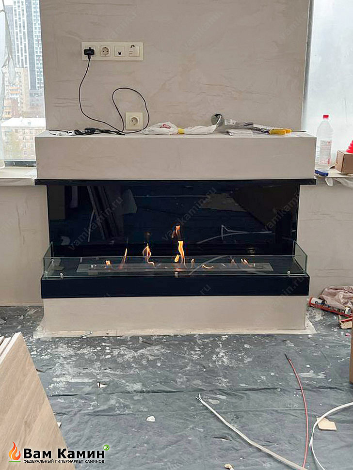 К сожалению на этапе чернового ремонта нельзя как следует увидеть, как будет сочетаться такой биокамин с окружающим интерьером. Но уже сейчас очевидно, что его строгий черный цвет заметно выделяется на общем фоне.